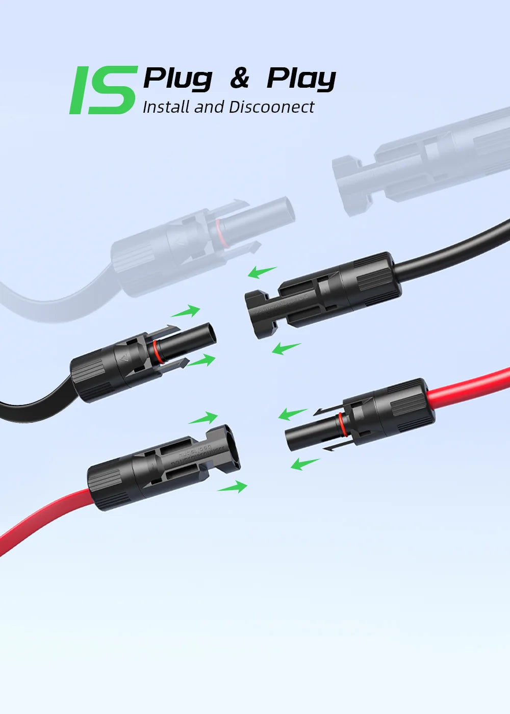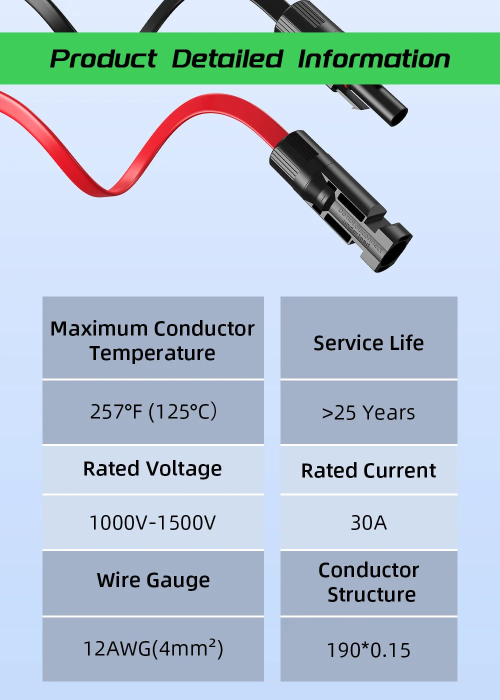 - 25+ Years Lifes Span: The solar cables are made from 4mm² braided copper wire. The inner core of the wire is braided with 190 tinned copper wires with a diameter of 0.15mm, with low contact resistance and high current and high voltage capacity. The wire sheath is made of XLPE material, which is resistant to high and low temperatures, fireproof and anti-corrosion, and anti-ultraviolet, and has a service life of up to 25 years.