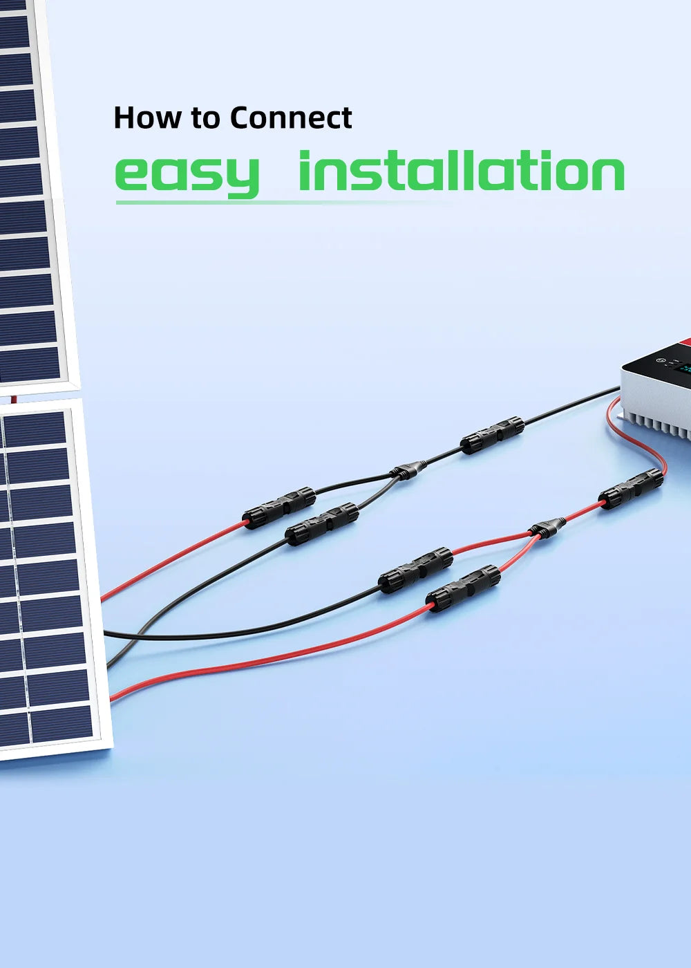 The solar connector has passed CE and TUV certification, 1 male to4 female (M/FFFF) and 1 female to 4 male (F/MMMM). It can connect 4 solar panels in parallel.rated current is 30A, rated voltage is 1000V DC,  keep your equipment stable at -40℃~+85℃ work.