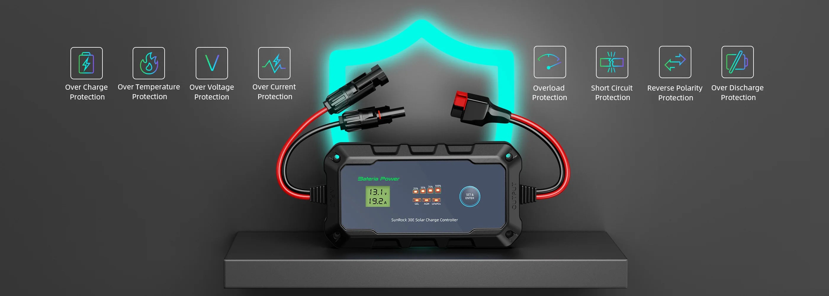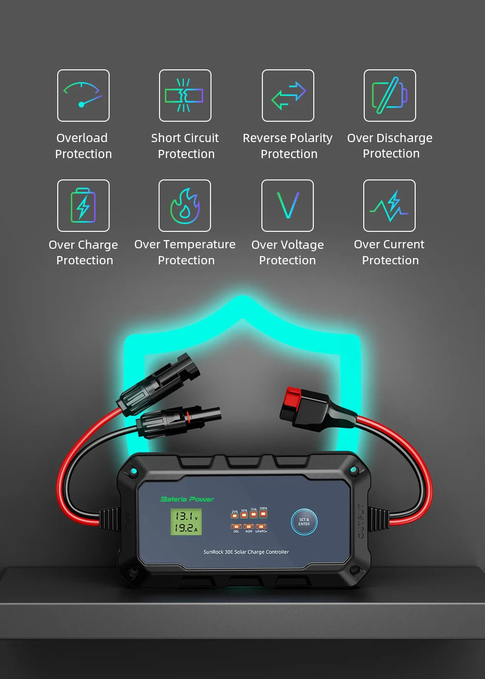 30A pwm solar controller has a built-in protection system and intelligent 3-stage charging (Equalize, Float, Boost), which means that the solar energy can be used to the maximum extent.