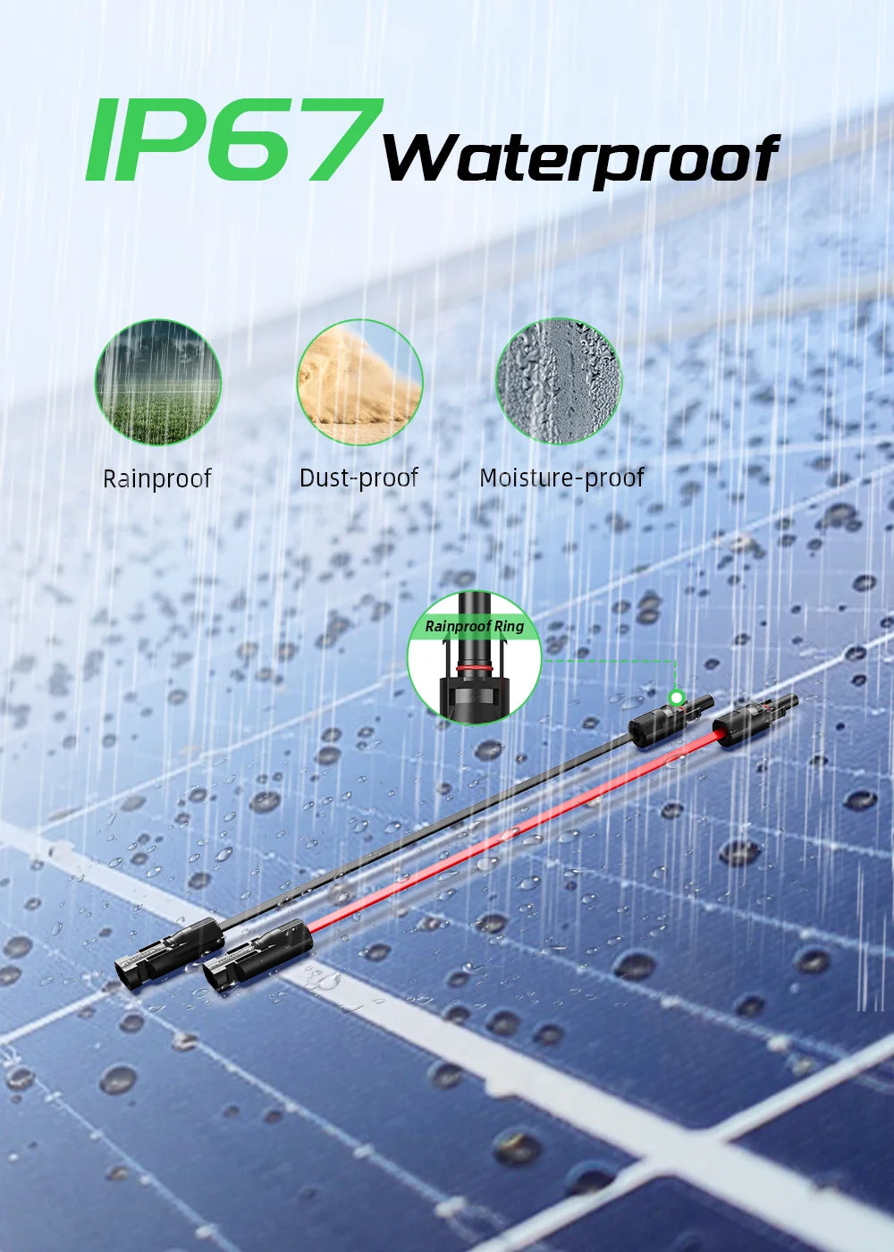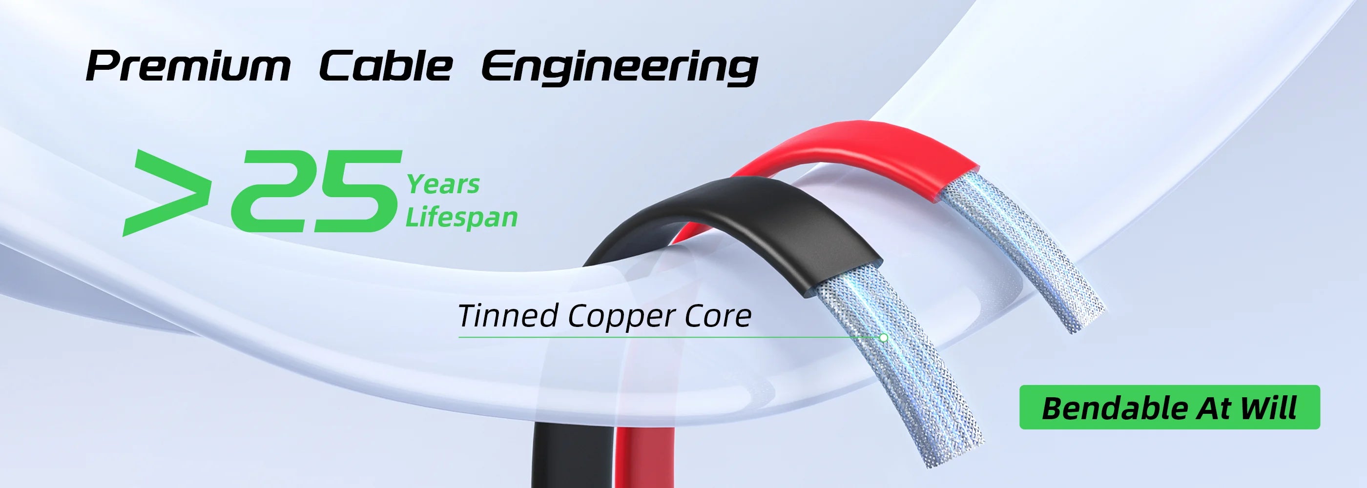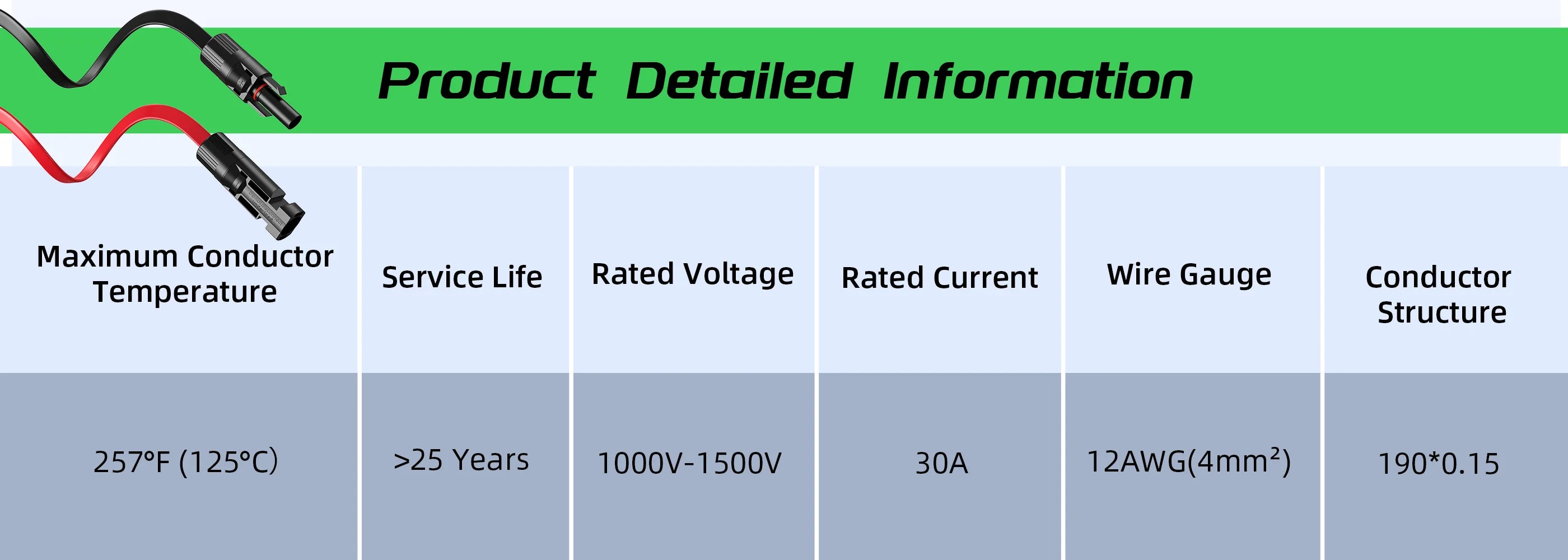 - 25+ Years Lifes Span: The solar cables are made from 4mm² braided copper wire. The inner core of the wire is braided with 190 tinned copper wires with a diameter of 0.15mm, with low contact resistance and high current and high voltage capacity. The wire sheath is made of XLPE material, which is resistant to high and low temperatures, fireproof and anti-corrosion, and anti-ultraviolet, and has a service life of up to 25 years.
